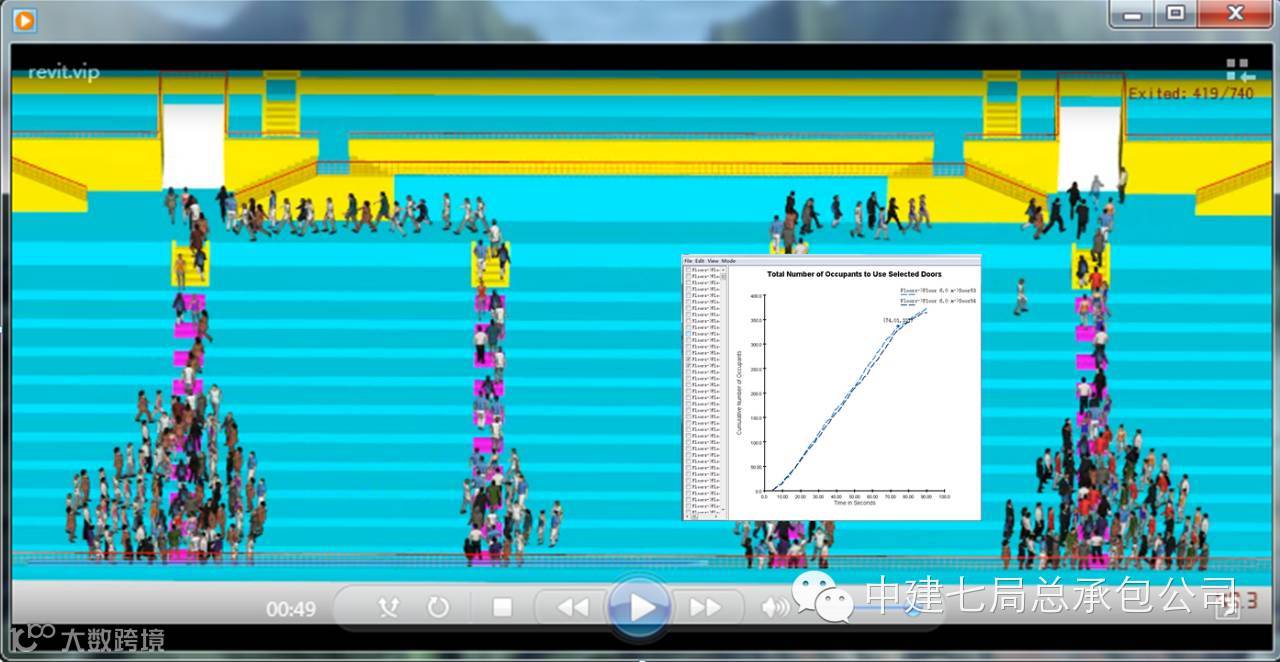 5、人员疏散模拟:利用BIM模型导入专业应急疏散模拟软件,进行人员疏散模拟。由此可以确定疏散时间,进行疏散路线优化,对辅助建筑设计起到重要的作用;