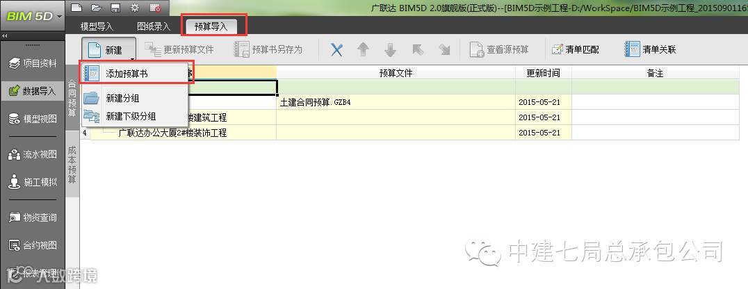 数据导入——预算导入——选择预算类型(合同预算/成本预算)——新建 添加预算书