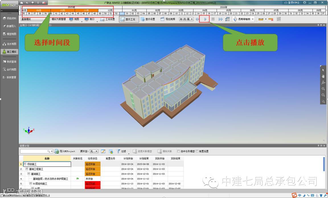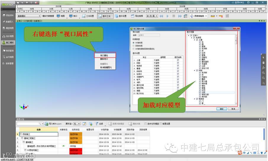 施工模拟——新建视口——右键选择“视口属性”——加载模型——选择时间段——点击播放