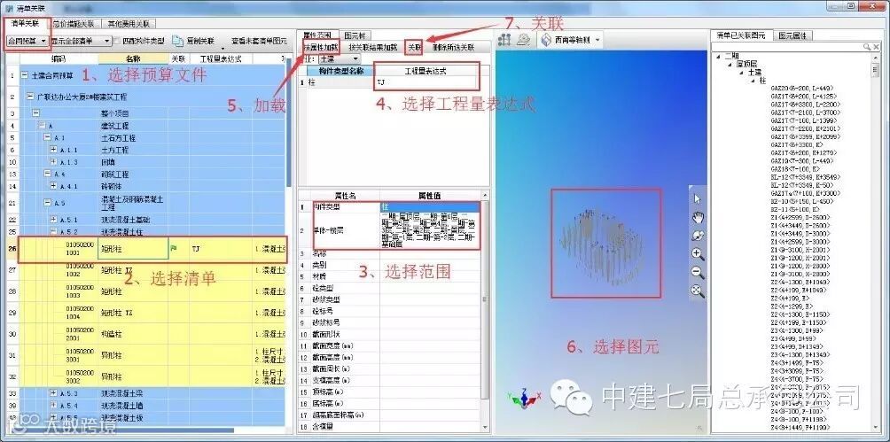选择预算文件——选择清单——选择范围——选择工程表达式——加载——选择图元——关联