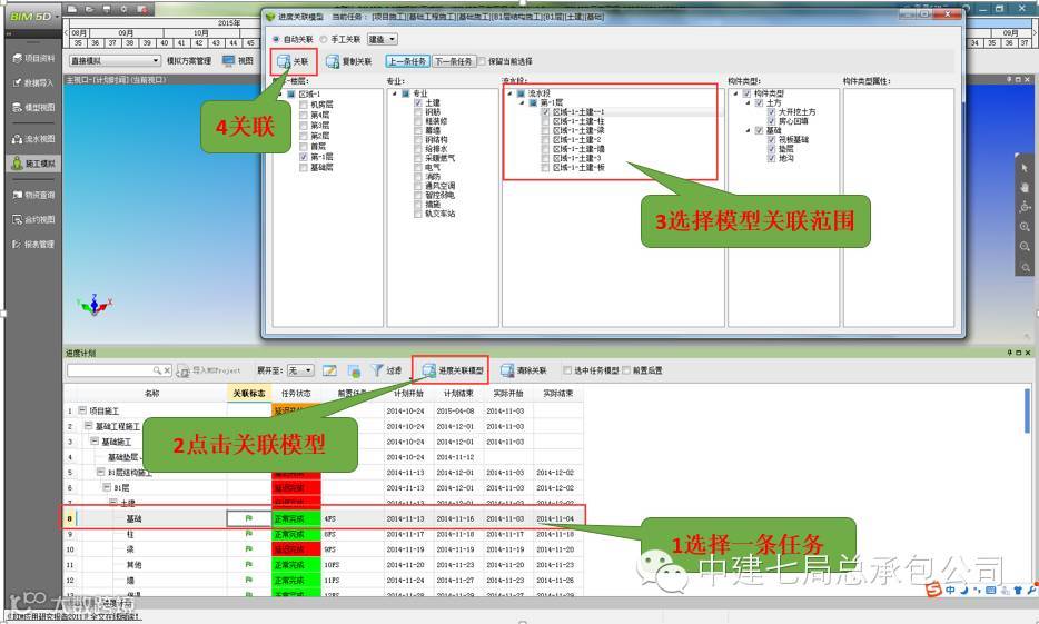 3、项目整体模型建立之后,制定出施工方案,按照施工进度计划,再利用Autodesk Navisworks 等仿真、管理工具来实现施工过程4D模拟。通过对施工全过程模拟,实现虚拟建造,从而加强项目管理可控性,提高工程质量、保证施工安全;