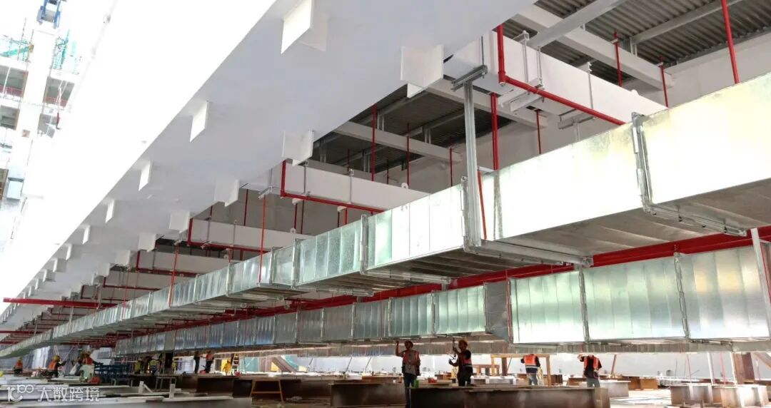 在整体提升中,为减少后期展面机电高空作业安全风险,合理穿插节约工期,项目联动钢构、机电、安装、幕墙等全专业一体化施工,采用了地面拼装,分块提升施工方法,严格按照专项施工方案进行,将金属展面底板、消防喷顶管线、通风管线等在地面安装后再整体提升至展面高度。同时各专业板块技术人员随时待命,使整个提升过程处于安全的可控状态。