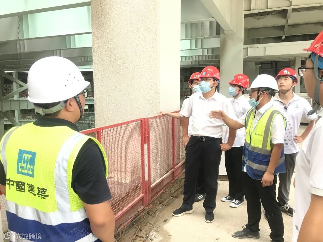 与会人员现场观摩西安电子科技大学广州研究院建设项目智慧展厅和样板间,及航空轮胎大科学中心项目设备坑、钢结构、幕墙施工工艺。