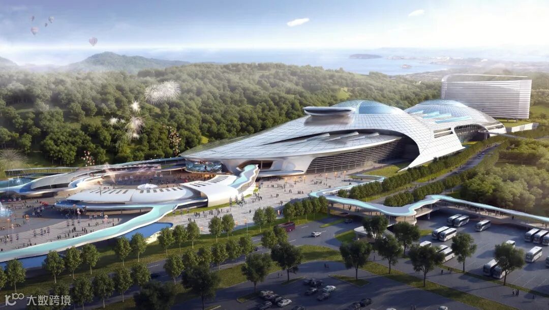 项目总建筑面积约39.57万平方米,高度60米,为主体钢筋混凝土框架+钢屋盖组合结构。屋盖网壳下为两大功能区:大鱼区,可容纳5000名游客在扇形阶梯看台观赏海洋动物表演;乐园区,游客可体验旋转风筝、转转船等众多游乐项目。
