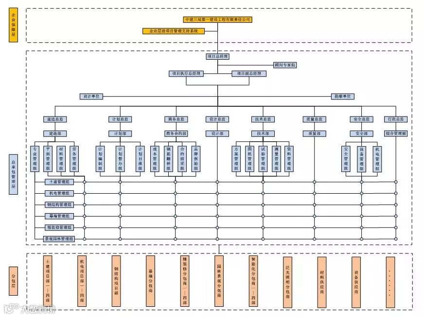 本项目分为一个总承包项目部及四个土建项目部。整体组织架构采用两层分离模式,总包管理层负责整体统筹、策划、管控、对项目负总责,土建项目部负责项目具体实施。