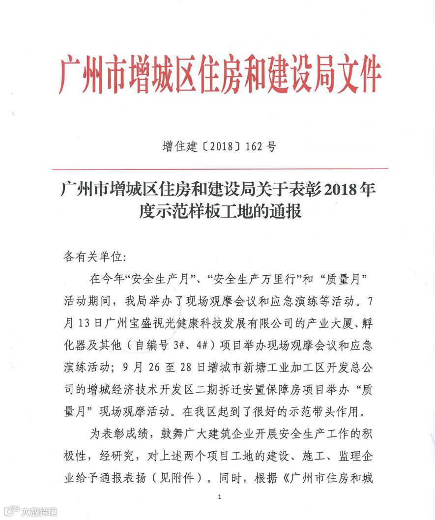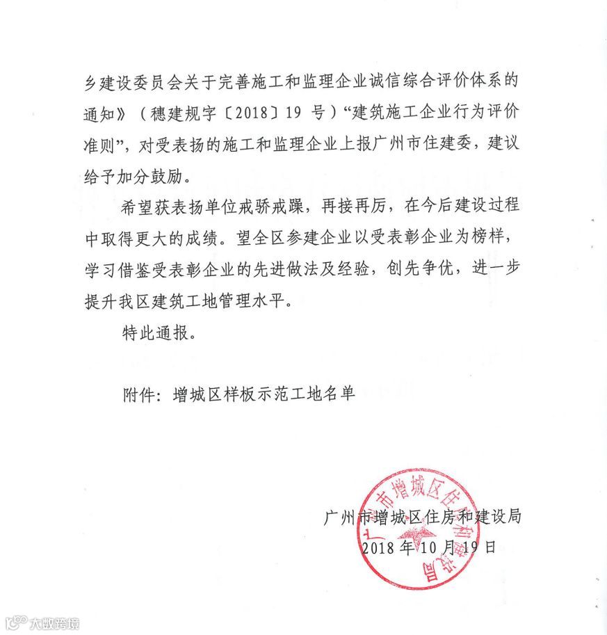 10月19日,华南公司广州增城宝盛项目部喜获广州市增城区住建局的通报表扬,指出项目成功承办了增城区2018年现场观摩会和应急演练活动,对全区的项目建设起到了很好的示范带头作用。据悉,今年以来,项目已三次获得增城区地方政府通报表扬。