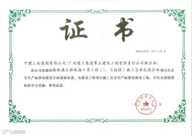 凭借始终如一的态度,珠海公司得到了行业和社会的认可。2016年6月,珠海公司获“国家守合同重信用企业”荣誉证书及奖牌;2017年,珠海公司荣获“全国五一劳动奖”、港珠澳大桥珠海口岸(I标段)获国家 AAA 级诚信工地。