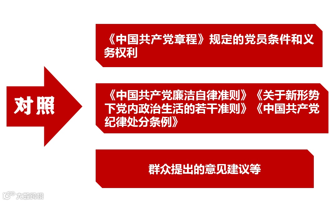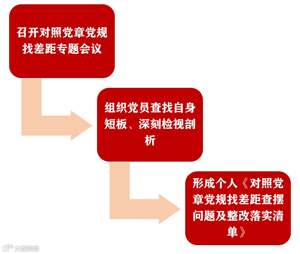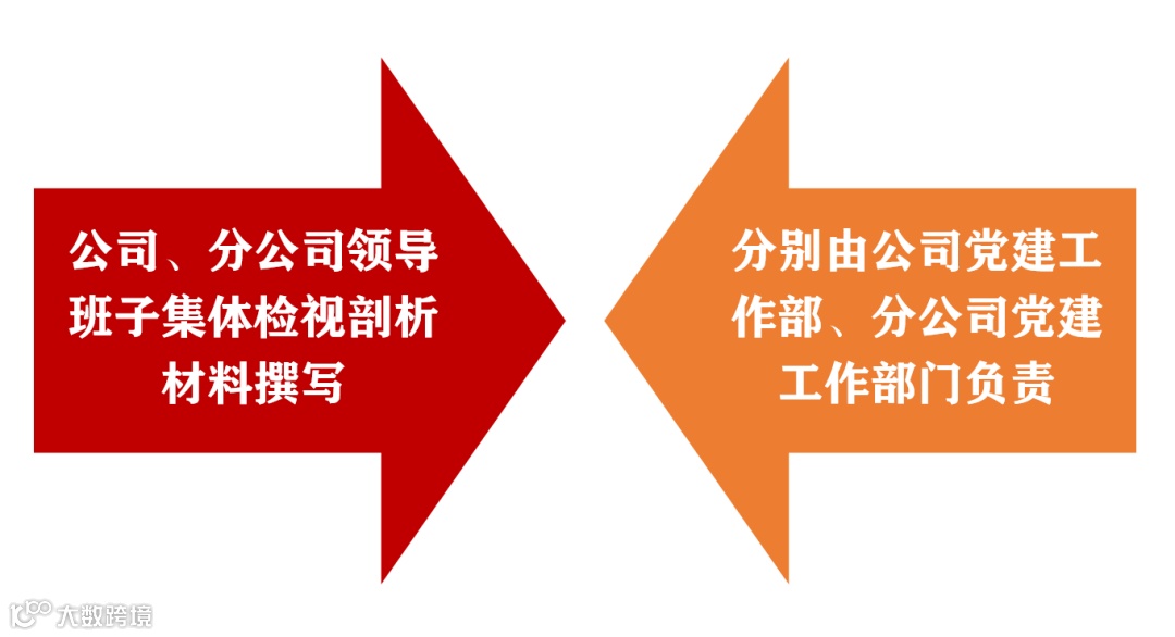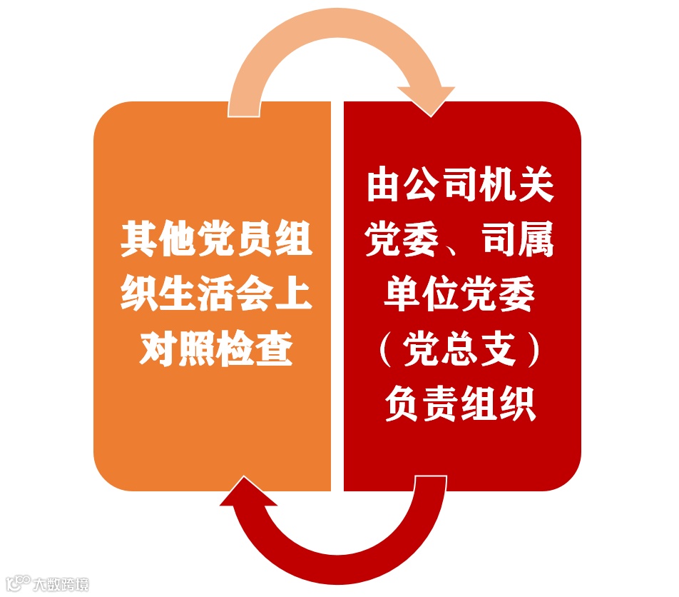 对照党章党规找差距专题会议 公司、分公司领导班子:分别由公司党建工作部、分公司党建工作部门负责 各支部:公司机关党委、司属各单位党组织统筹 |