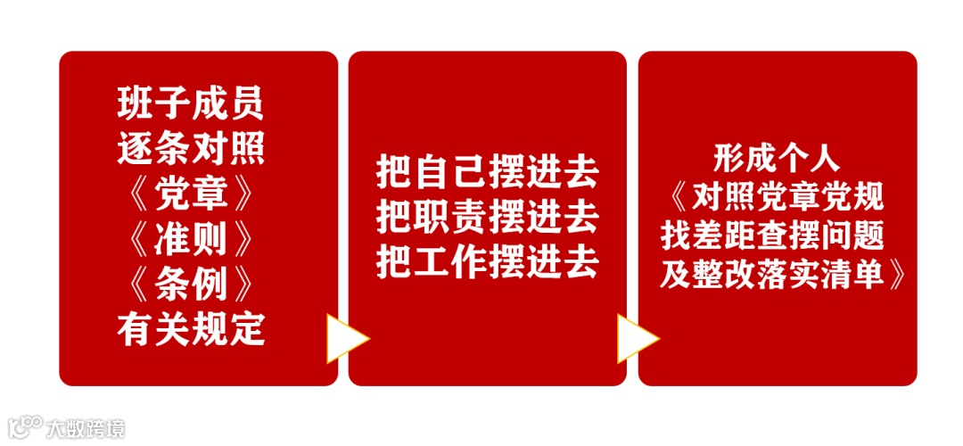 召开对照党章党规找差距专题会议,形成开展情况报告报上级党组织 领导班子将对照党章党规找差距情况报告汇编报上级党组织 分公司领导班子集体和个人检视剖析材料报公司党委 |
