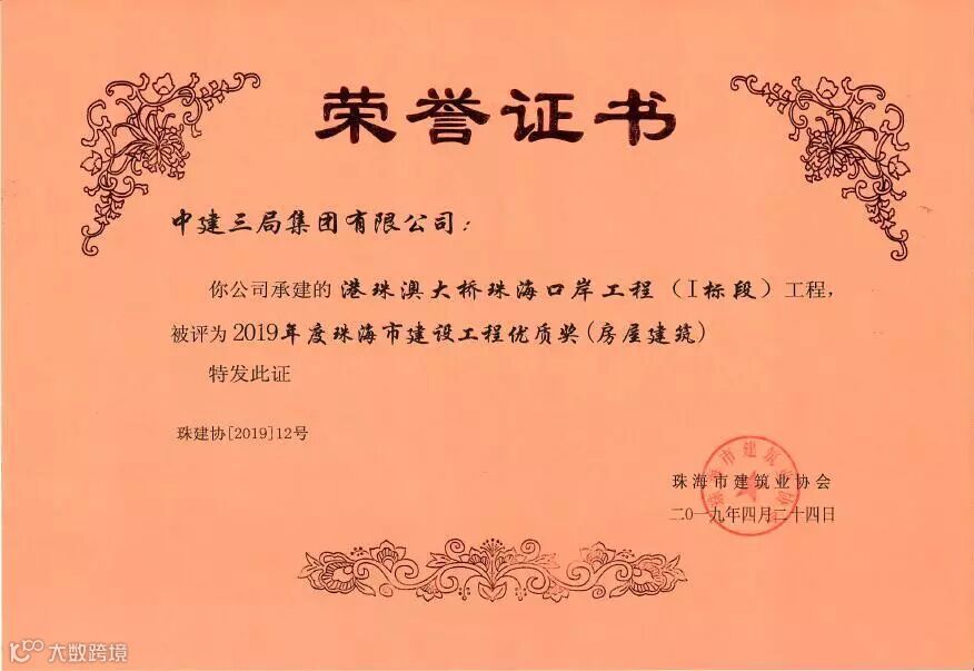 5月22日,中建三局集团有限公司承建的港珠澳大桥珠海口岸工程(I标段)项目再获殊荣,该项目获得珠海市建设工程优质奖,继2017年继获评”广东省建筑结构优质奖”后再添荣誉。