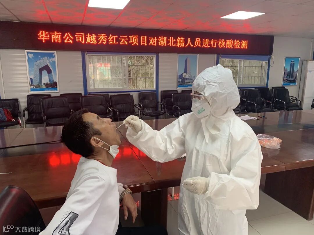 ● 4月9日上午,华南公司越秀红云化工厂项目开展定点核酸检测活动,为近百名湖北籍管理人员和工人进行免费核酸检测。(通讯员 黄薇)