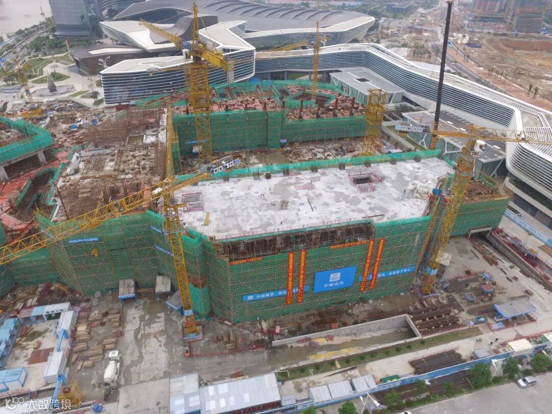 该项目总工期1050天,其展厅部分采用11根跨度72米、单根重量200吨的跨钢箱梁和上下弦次梁组成,屋面采用金属屋面,幕墙采用铝锰镁金属屋面和外立面幕墙(玻璃幕墙、铝合金方管格栅、铝单板幕墙、GRC造型线条)组合而成。项目施工克服了超重大跨钢箱梁进场、超重钢柱吊装配合、平面布置可利用空间较小,以及配合预留中庭结构等施工困难,顺利实现北区封顶,通过结合工序穿插,对钢构、幕墙、安装总包管理,为年底外立面完成进行冲刺。