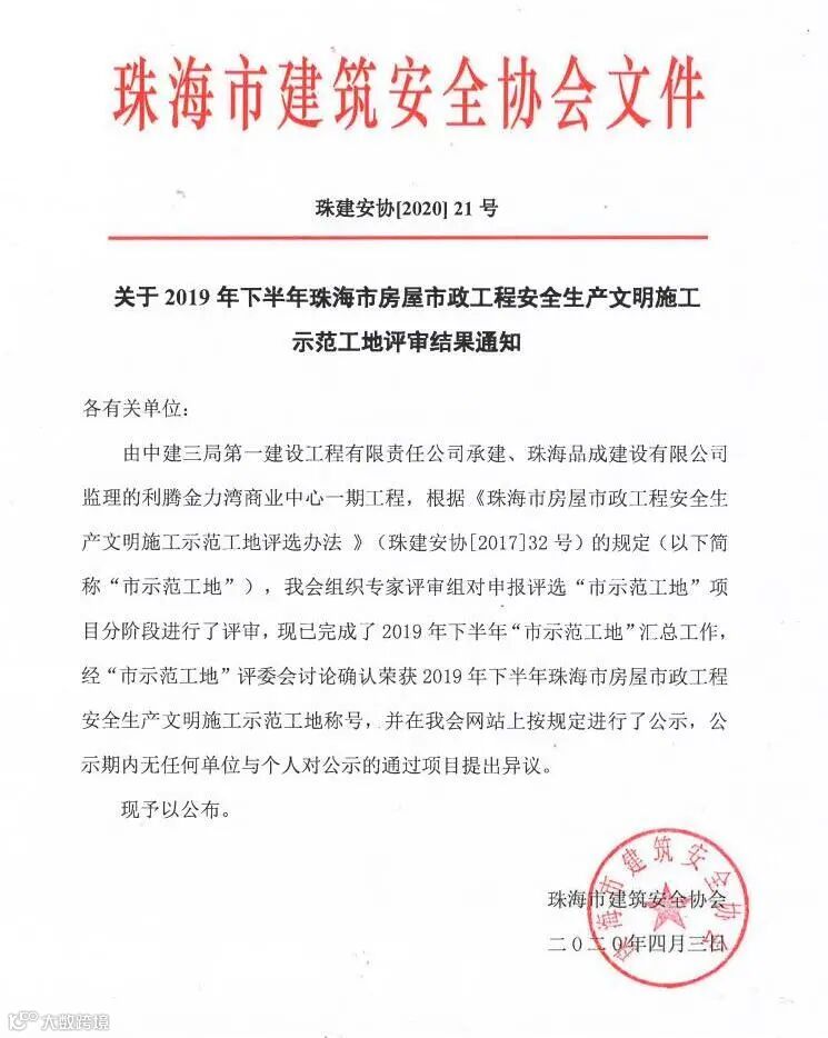 ●近日,华南公司珠海公司利腾金力湾商业中心一期项目荣获2019年下半年珠海市房屋市政工程安全生产文明施工示范工地称号。(通讯员 周桂玲)