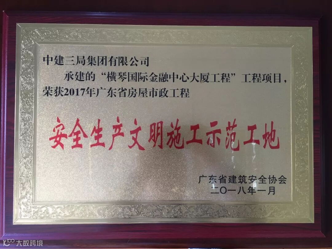 近日,珠海公司传来捷报,横琴国际金融中心大厦项目荣获“2017年度广东省房屋市政工程安全生产文明施工示范工地”称号。