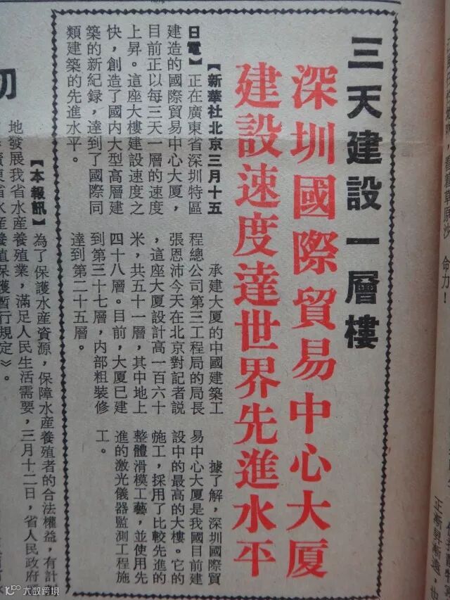 1984年3月15日,新华社向全世界发布一条消息:正在建设中的中国第一高楼深圳国贸大厦主体建设速度创造了“三天一层楼”的新纪录,这是中国高层建筑历史上的奇迹,标志着我国超高层建筑工艺达到了世界先进水平,从此,“三天一层楼”的“深圳速度”享誉中外,成为改革开放的代名词,载入了特区建设、中国建设的史册。