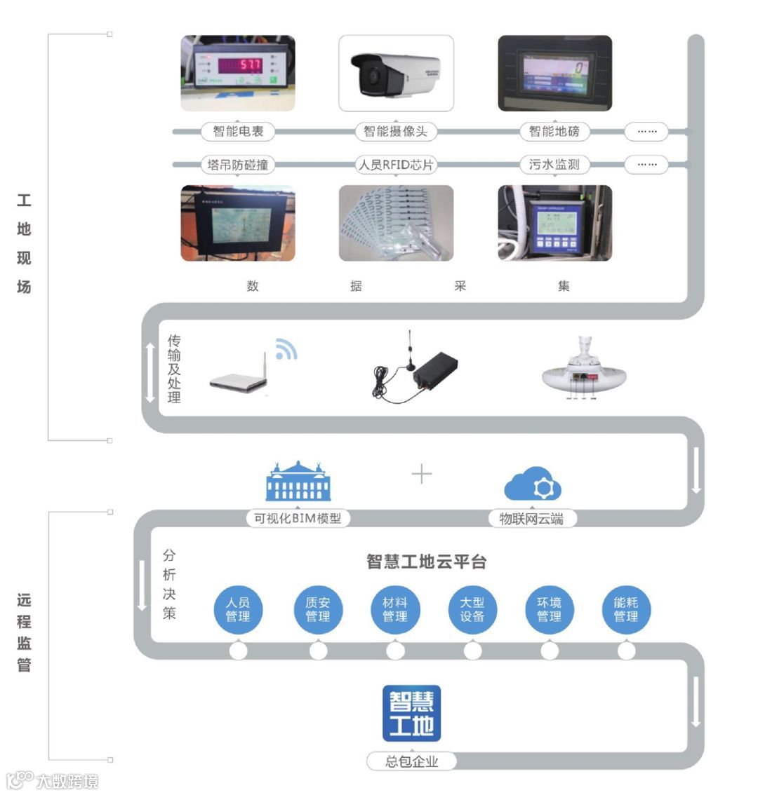 此外,项目工地还综合运用物联网、云计算、大数据、移动通讯等技术手段,通过在施工现场布置各种传感器设备和无线传感网络,将各类数据集成至智慧工地云平台中,由云端服务器对数据进行智能处理,同时与反馈控制机制联动,实现对施工现场人、机、料、法、环的全面监控与分析,项目业务流程的全面管控。