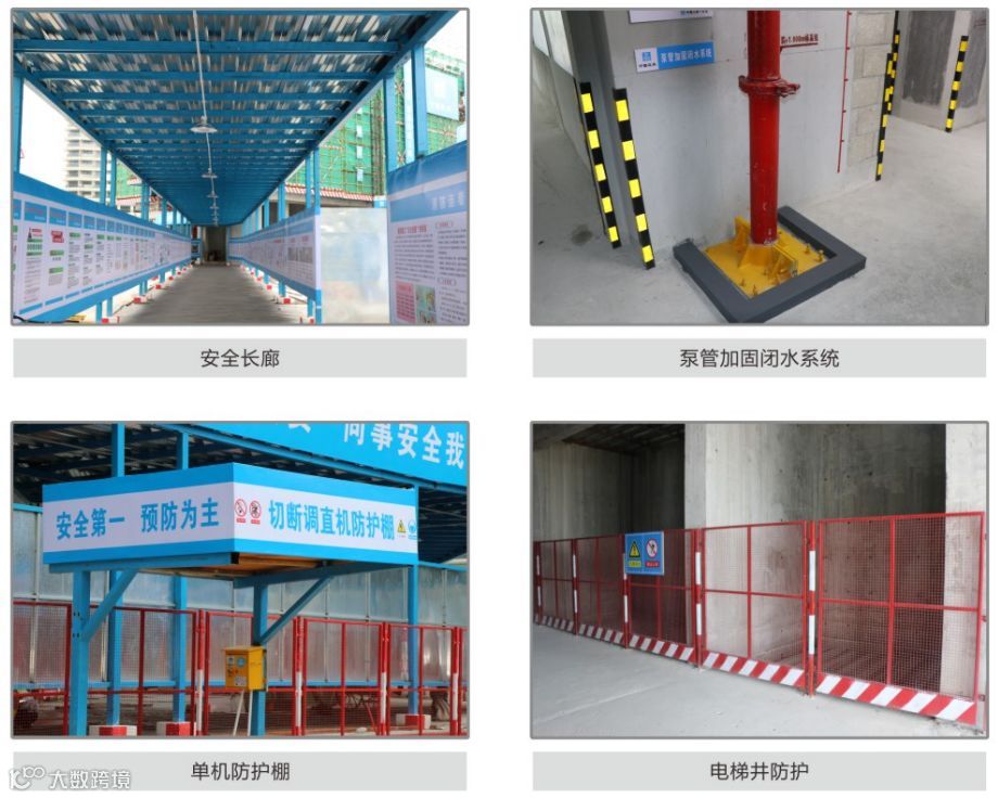 严格按照中建三局标准化图册要求,创建安全标准化现场,工具式安全通道,临边洞口防护,压型钢板电梯井硬封闭防护,标准化钢筋车间,泵管加固闭水系统,塔吊标准节闭水系统,悬挑工字钢硬封闭、人车分流,保证现场安全文明施工,实现快装快拆、周转使用、环保经济的综合效益。