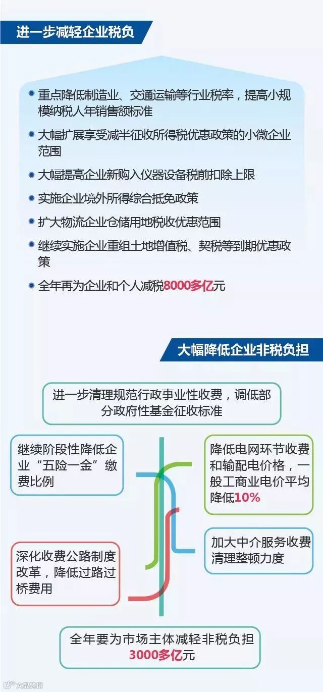 降成本:再为企业和个人减税8000多亿元。