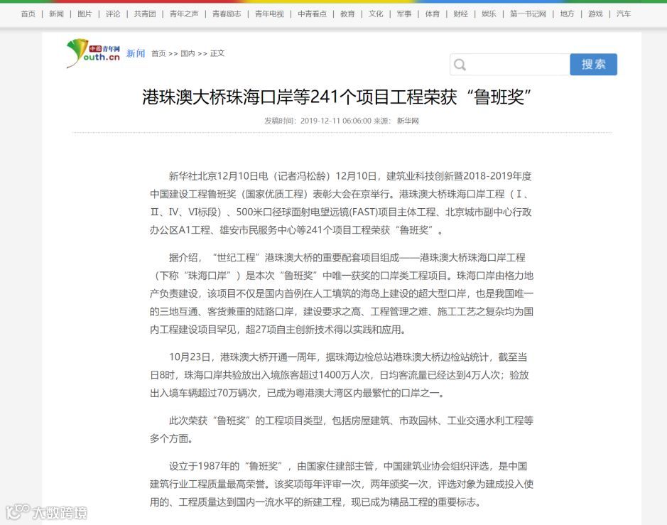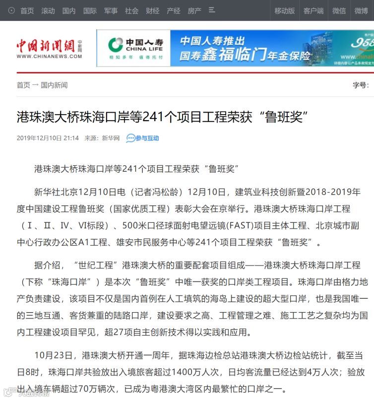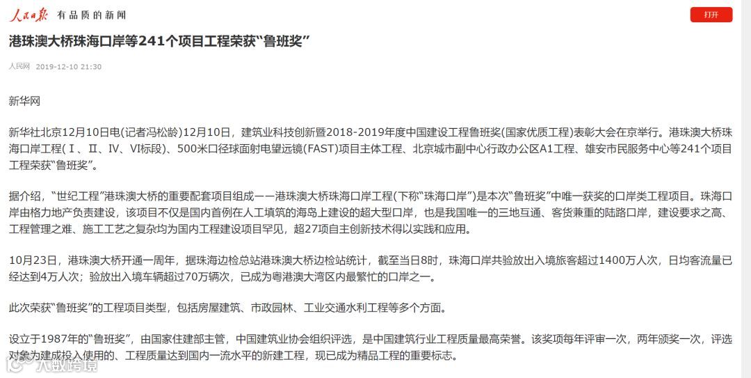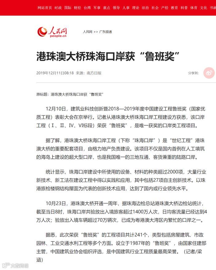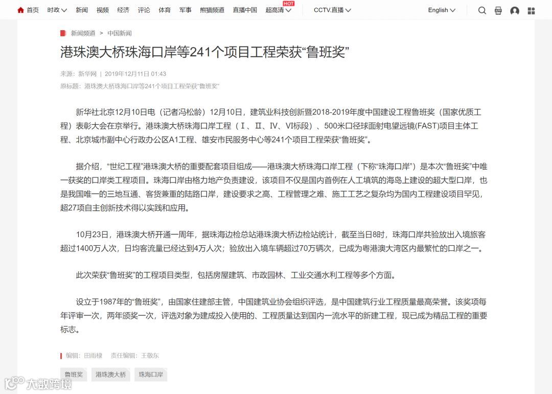 港珠澳大桥珠海口岸获鲁班奖新闻备受关注