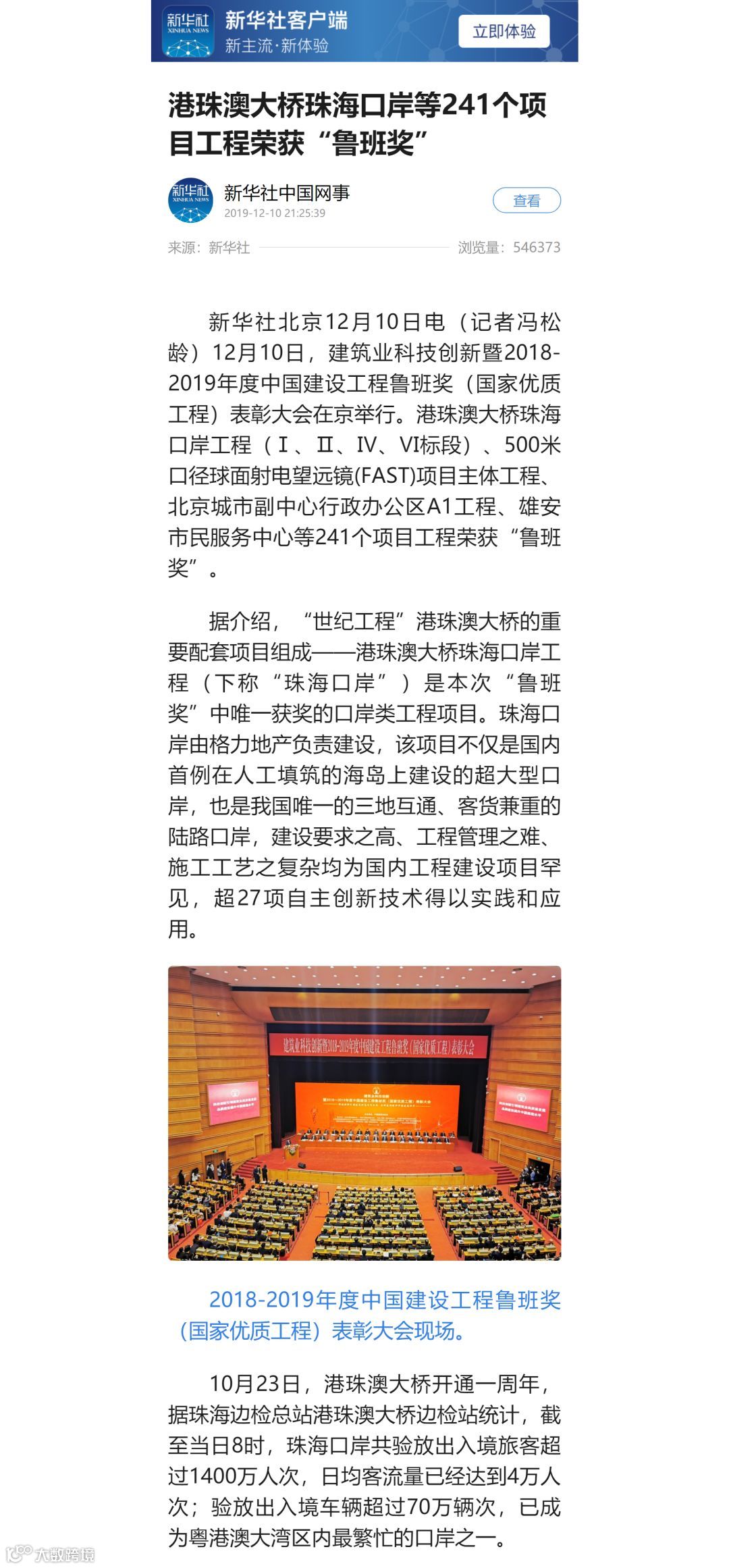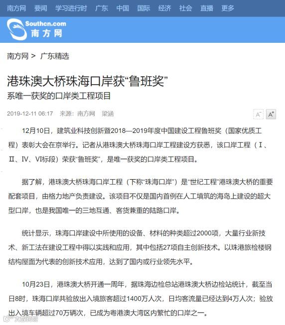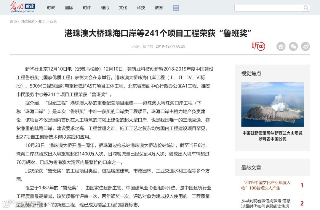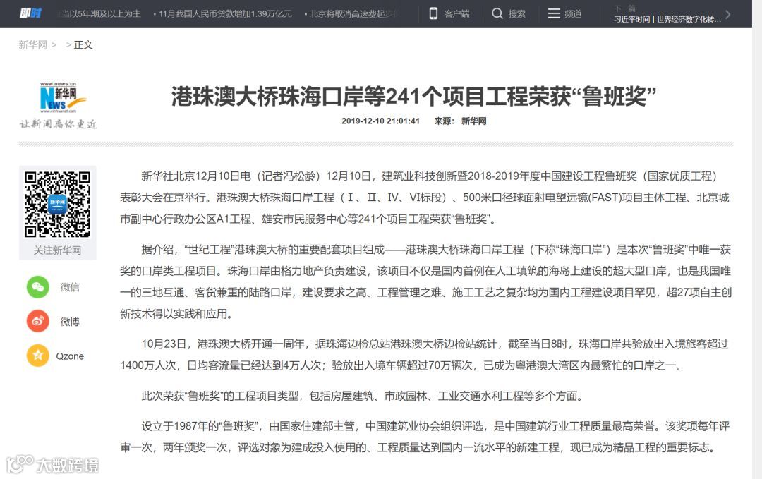 港珠澳大桥珠海口岸获鲁班奖新闻备受关注