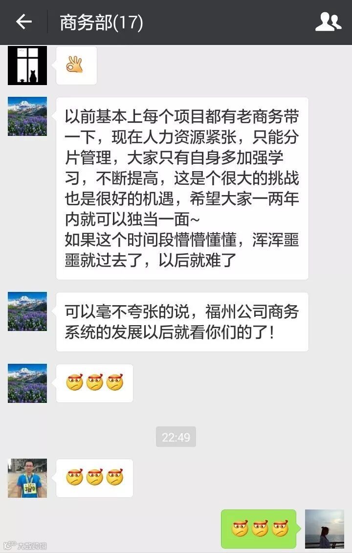 我的手机截图里一直存着一段我们商务部陆经理说过的话:“现在人力资源紧张,只能分片管理,大家只有自身多加强学习、不断提高。这是个很大的挑战也是很好的机遇,希望大家一两年内就可以独当一面~如果这个时间段懵懵懂懂、浑浑噩噩的就过去了,以后就难了。”我曾把这段话在我的家人微信群里发了,他们纷纷点赞,在这里也把这段话转告给大家,希望大家最终都能收获好多好多赞。