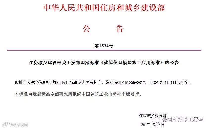 住建部印发国家标准《建筑信息模型施工应用标准》编号为GB/T51235-2017,自2018年1月1日起实施。
