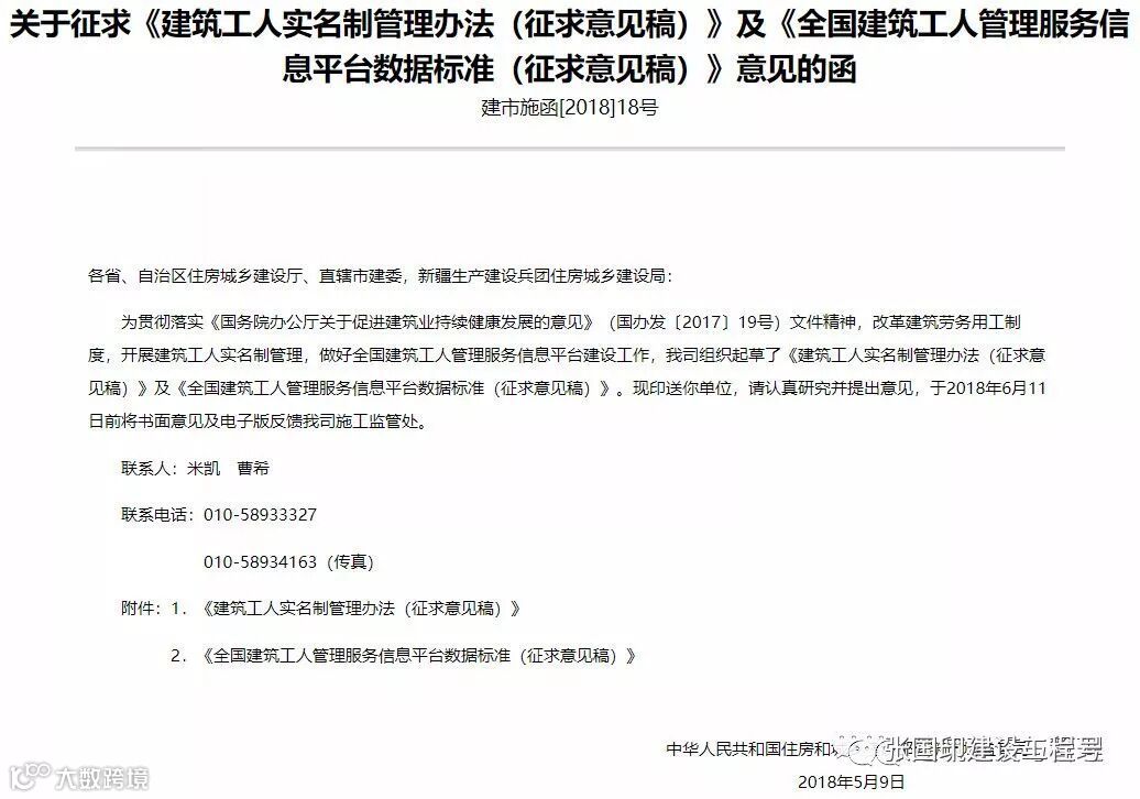 函件指出,为贯彻落实《国务院办公厅关于促进建筑业持续健康发展的意见》(国办发〔2017〕19号)文件精神,改革建筑劳务用工制度,开展建筑工人实名制管理,做好全国建筑工人管理服务信息平台建设工作,住建部建筑市场监管司组织起草了《建筑工人实名制管理办法(征求意见稿)》及《全国建筑工人管理服务信息平台数据标准(征求意见稿)》。现印送各省、自治区住房城乡建设厅、直辖市建委,新疆生产建设兵团住房城乡建设局征求意见。