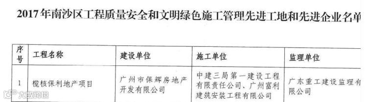 近日,由华南公司承建的保利榄核项目被表彰为2017年南沙区工程质量安全和文明绿色施工管理先进工地。