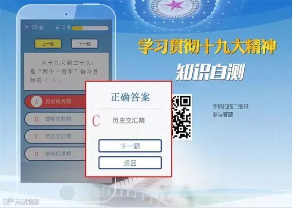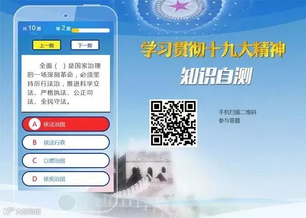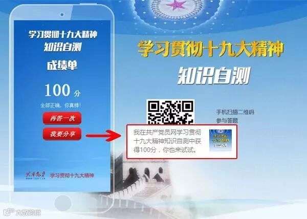 大家可登录共产党员网首页,进入“学习贯彻十九大精神知识自测”专区进行答题,或者通过手机扫描二维码参与答题。