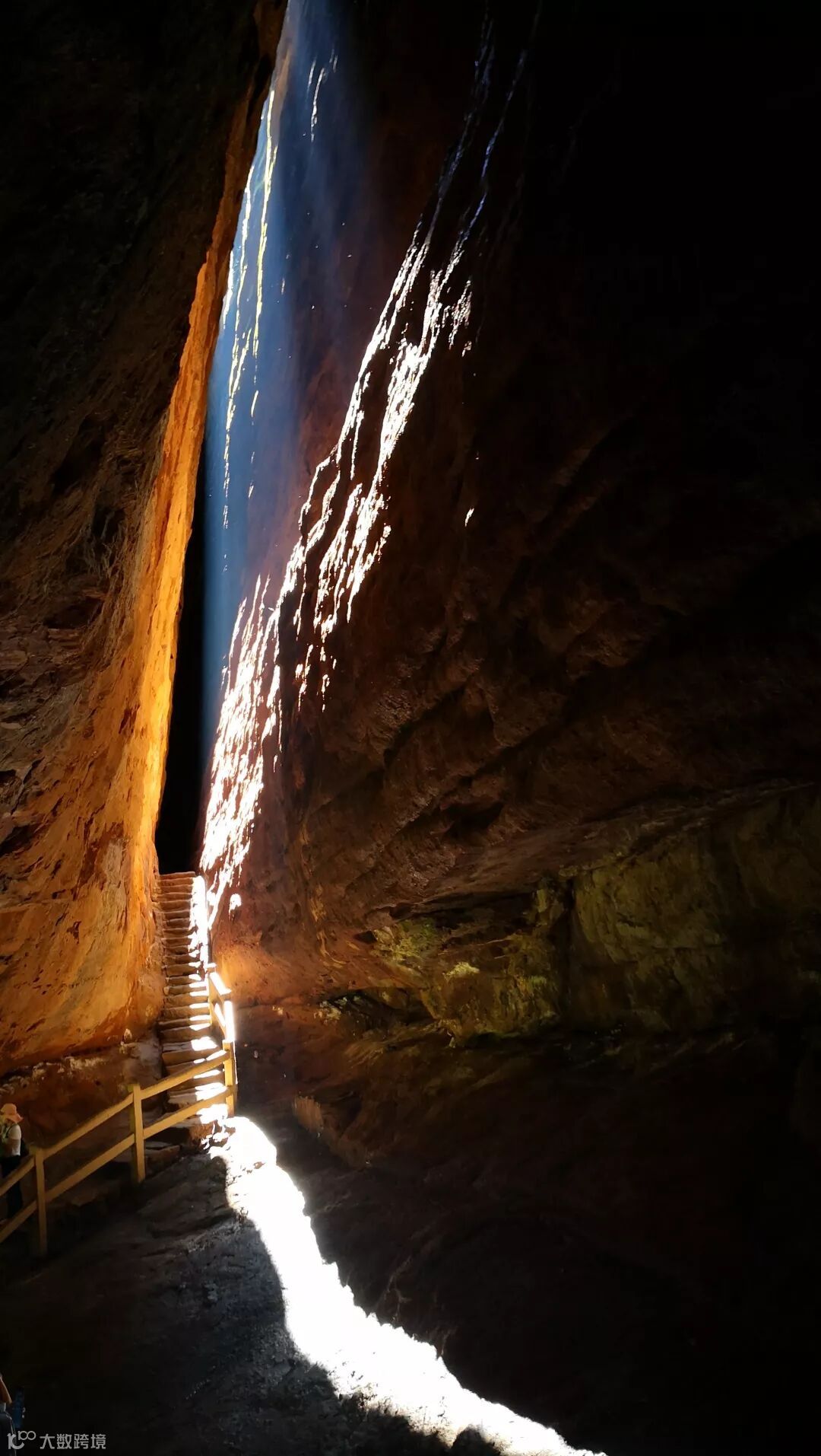稍息片刻后,我们来到了旅途第一站一线天,百米之远便能感受到四处弥漫着浓郁的“福气”,抬头望去一座巍然挺立的巨石,长数百丈,高千仞,名“灵岩”。岩端倾斜而出,覆盖着三个毗邻的岩洞:左为灵岩洞,中为风洞,右为伏羲洞。从伏羲洞而入岩内,到了深处,抬头仰望,但见岩顶裂开一缝隙,就像是利斧劈开一样,相去不满一尺,长约一百多米,从中漏进天光一线,宛如跨空碧虹,这就是令人叹为“鬼斧神工之奇”的一线天。