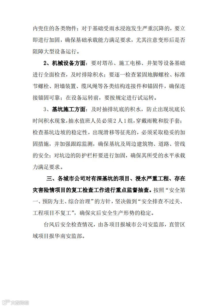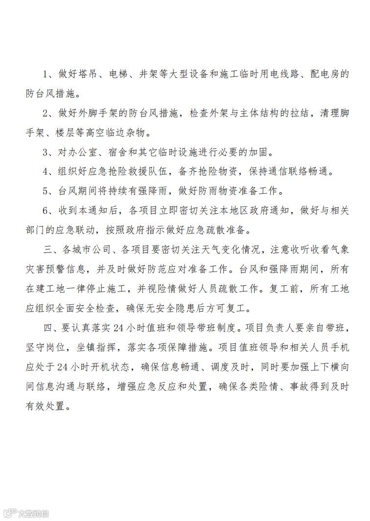 各项目立即启动防台风三级应急响应预案,成立防台指挥小组,对生活区、办公区临水临电设施逐一排查隐患、落实防护措施,对施工现场脚手架、机械设备全面检查,项目人员100%安全撤离,重要物资资料进行防护、整理、转移,提前备好应急救援物资,密切关注天气变化情况,及时做好防范应对准备工作。