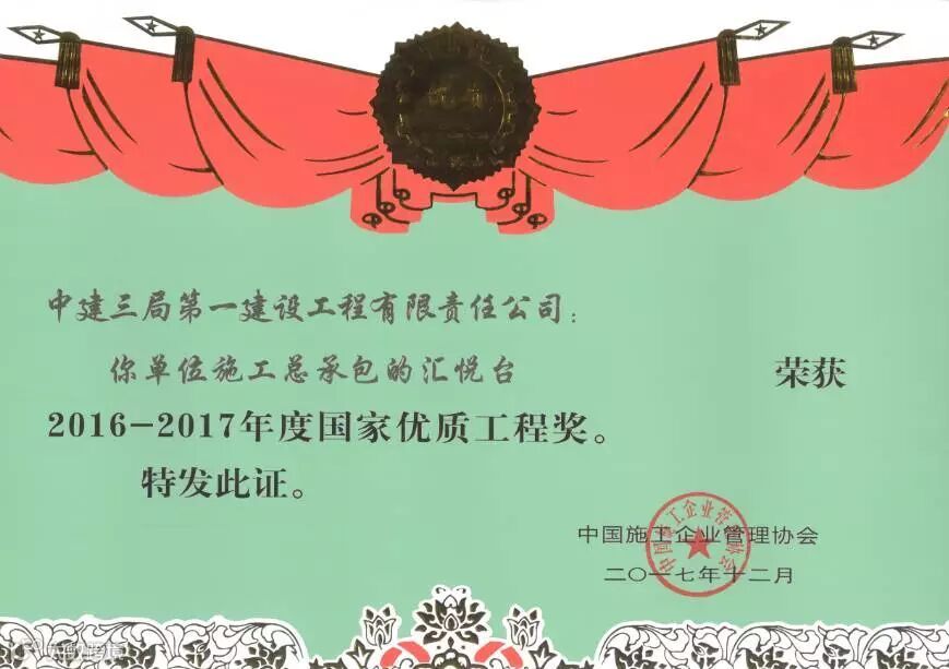 12月13日,2016-2017年度国家优质工程奖总结表彰大会在北京人民大会堂举行。由中建三局一公司华南公司承建的广州汇悦台工程经中国施工企业管理协会国家优质工程奖评审委员会评定为国家优质工程,荣获国家优质工程奖。