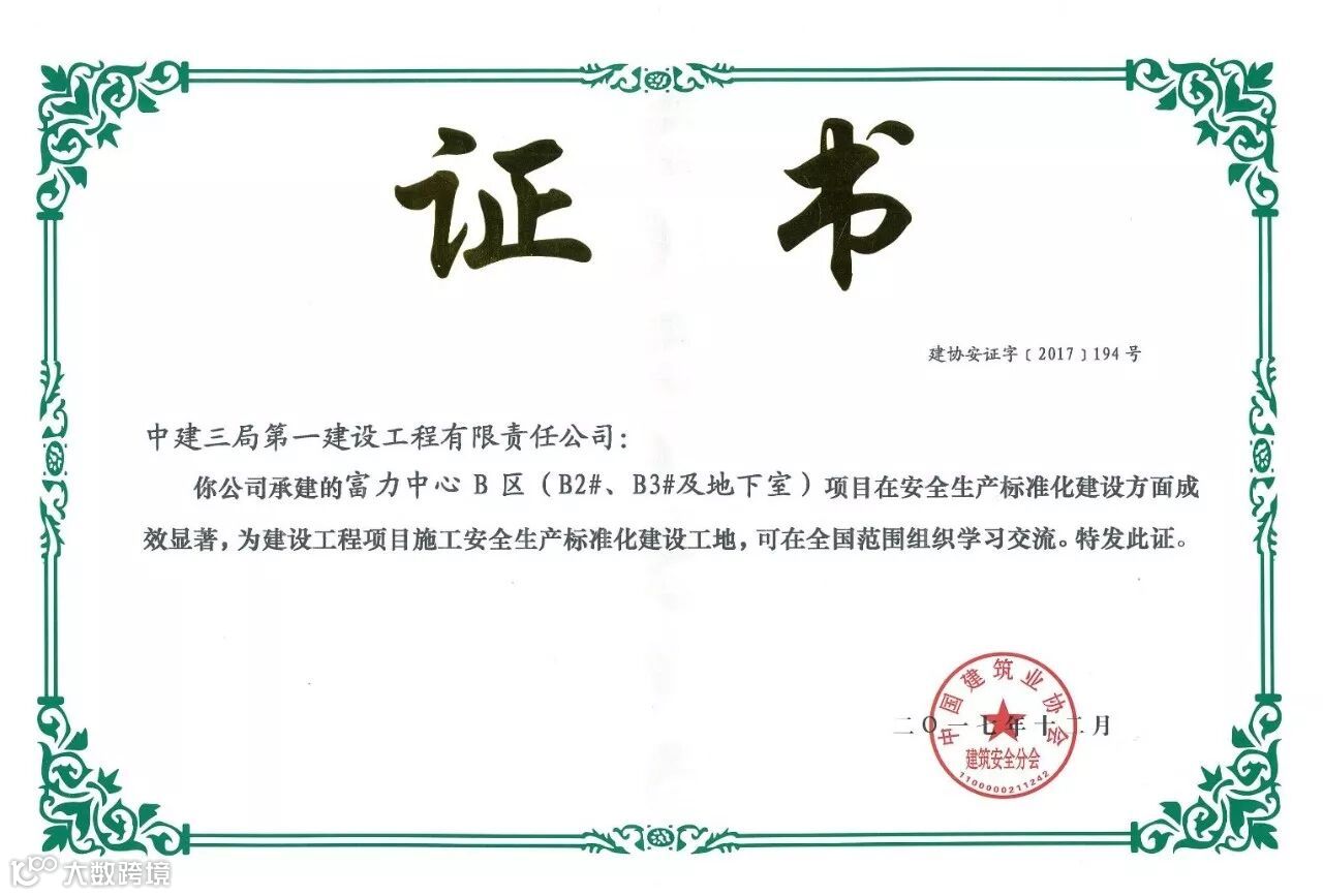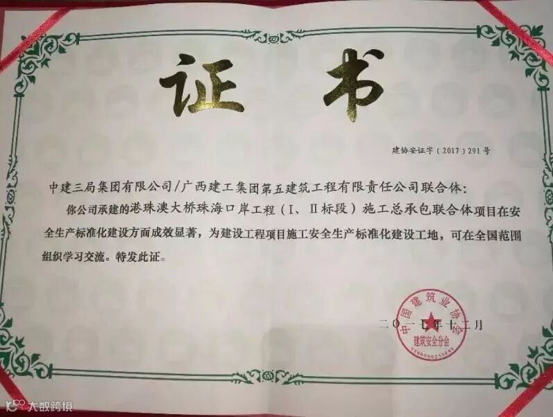12月13日,2017年国家级安全生产标准化建设工地颁奖大会在武汉欧亚会展国际酒店举行。华南公司港珠澳大桥珠海口岸I标段、富力中心B区两项目获此殊荣。