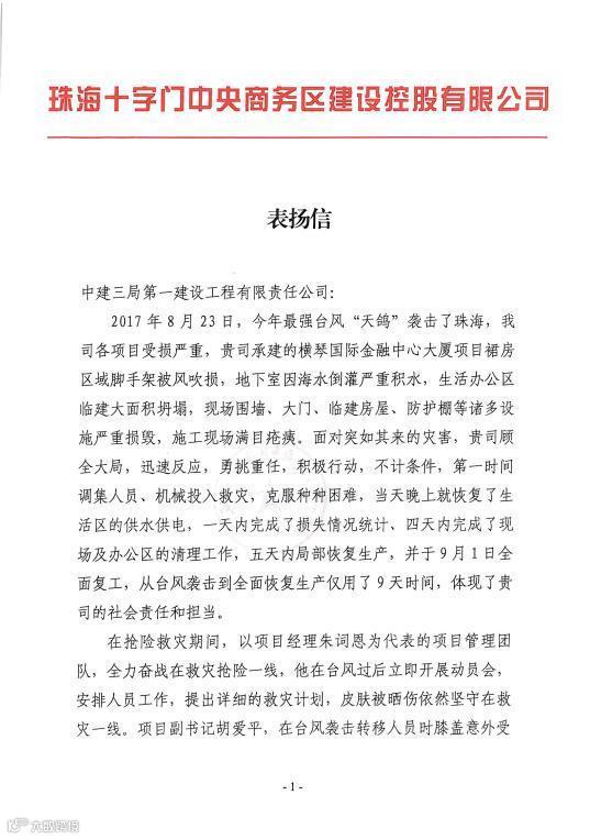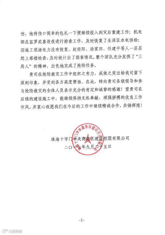 信中对以项目经理朱词恩为代表的项目管理团队在台风“天鸽”“帕卡”接踵而至、抗台救灾重建过程中,能够顾全大局、勇挑重任、积极行动、顽强拼搏,保证项目在受灾后能够迅速恢复生产等表示充分的肯定及诚挚的感谢。