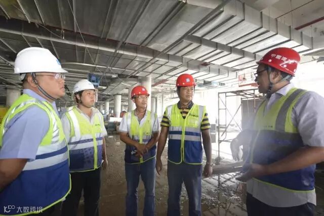 在离开项目时,我们看到孙国华、李伟杰、黄冈维、王路在0米层聚在一起,共同开展巡查,商讨施工事宜。数位土建、安装、装饰的工长围在一边,在他们四周,是往来不断的自行升降车、叉车、材料运输车,焊接管道、风管的焊花如雨绽放,各种机械的轰鸣,工人们的呼号声此起彼伏,一派火红的施工场景图生动的展现在我们眼前。