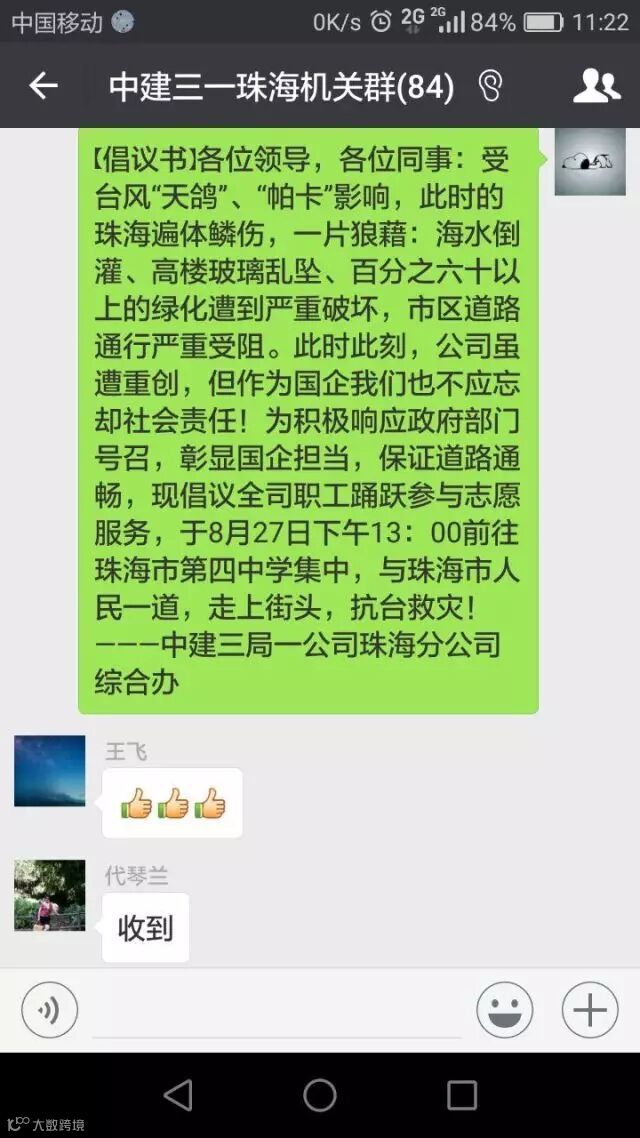 8月27日中午11时,华南公司珠海公司微信群中出现了一封倡议书,号召全体员工走上街头,投入到珠海市抗台救灾中,为早日恢复城市面貌尽一份力。