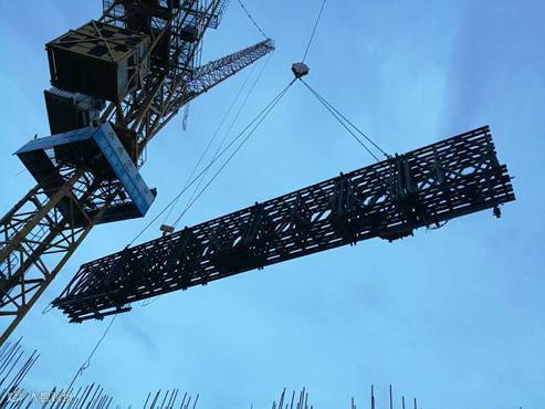 2.拆塔吊:项目主楼上有2#和3#两台动臂塔吊,由于结构变化,3#塔吊需要进行移位变为7#塔吊。在逾200米的高空中完成近100吨塔吊的移位工作,难度之高,危险之大可想而知。项目经理朱词恩打趣的说:“在这么高的空中进行移位,感觉就像是塔吊在空中漫步一样!”“空中漫步”听来有趣,可实际工作却并不轻松,所有人都一丝不苟,不敢有半分松懈。由于转移后的位置非常接近2#塔吊,安装工作极具危险性,项目部派遣了最优秀的塔吊司机与指挥,并安排机电与安全部全程旁站指导,最终圆满完成了移位工作。