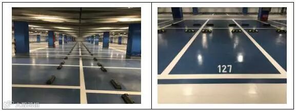 地下车库环氧树脂地面平顺、光滑、色彩鲜艳明快。