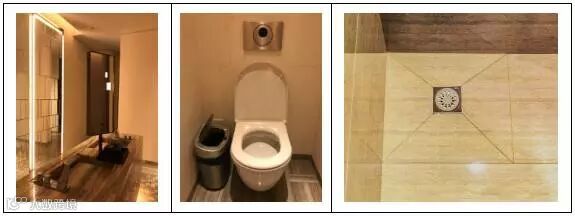 卫生间灯光绚丽,便捷舒适;洁具居中对称;地漏套割精细。
