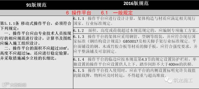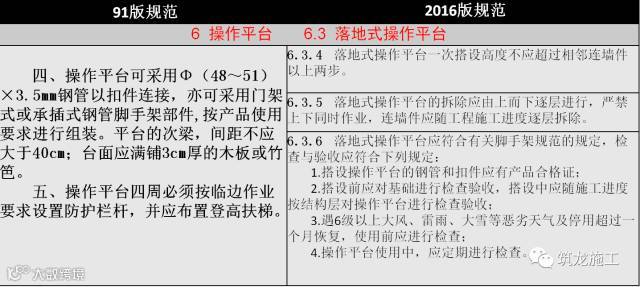 6.3.1 对落地式操作平台,本条列出了五项应遵守的规定,具体搭设时,尚应遵守相关脚手架规范的规定。