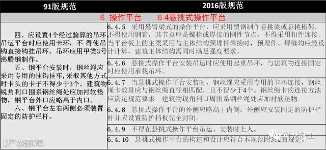 5、将原“操作平台和交叉作业”章节拆分为“操作平台”和“交叉作业”两个章节,其中操作平台分为移动操作平台、落地式操作平台与悬挑式操作平台,交叉作业分为安全防护棚和安全防护网,并分别作出具体规定;