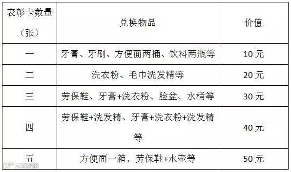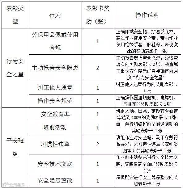 每月统计个人上月表彰卡发放情况,评选出三名获得表彰卡最多的工人为“行为安全之星”,并给予相应的现金奖励。