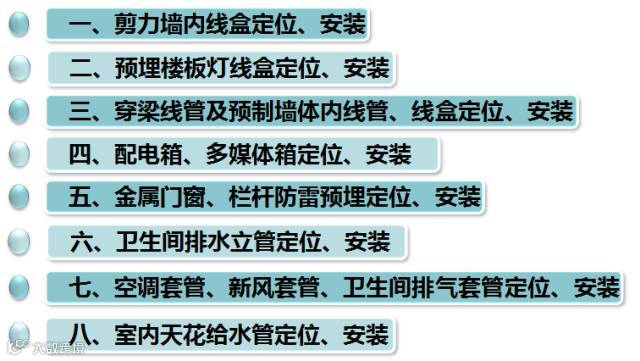 2、要求室内装修水电精确定位;交标柜体深化图前置倒推水电定位;强弱电线管楼板预埋,给水管天花内穿梁敷设;室内预埋孔洞精确定位。