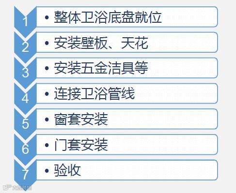 整体卫浴采用模块化设计,工厂预制化生产,共分为八大模块,组装高效。整体卫浴为工厂产业化全预制生产,施工现场采取整体吊装或现场拼装的方式,安装效率大大提升。
