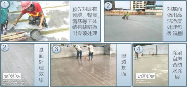 实施自愈合防水需要具备的条件:遇水区域的主体结构施工质量应符合设计文件及相关规范规程要求:不允许出现蜂窝、异物、露筋(钢筋保护层不足),以及贯穿性裂缝的缺陷;遇水区域的主体结构如果存在蜂窝、露筋、孔洞、异物等异常,应采用相配套专用材料和特种工艺技术做出置换或固封,不得以传统方法处理。