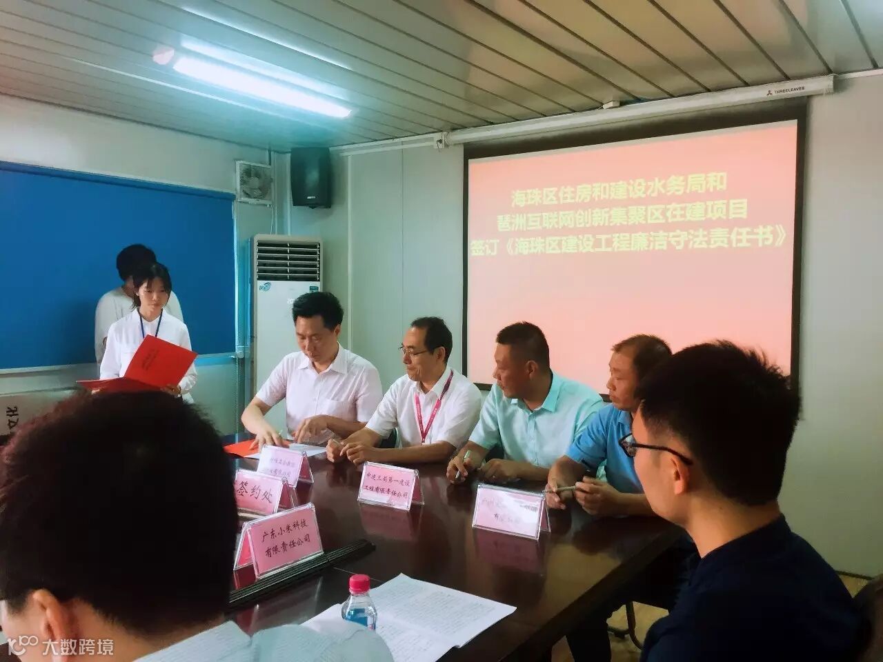 在项目会议室,海珠区住房和建设水务局局长陈伟锋向与会人员介绍了琶洲互联网创新集聚区廉政文化进工地活动的情况,并与在建项目的建设、施工、监理单位负责人签订《海珠区建设工程廉洁守法责任书》。随后海珠区监察局局长雷兆阳就廉政文化进工地的目的、意义和在现实中如何落实等方面提出了相关意见和要求,并向各示范点工地进行授牌。