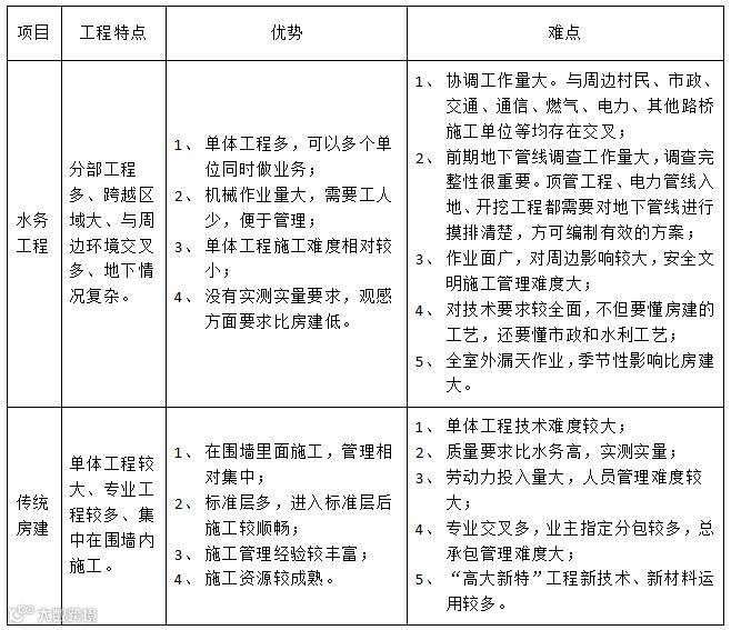 通过以上五个方面的比较和分析,传统项目和水务项目各有特点和难点。传统项目按现在流行的“高、大、特”工程技术难度比市政项目大;水务工程主要是对地下情况的摸排和协调处理及征迁工作的不确定因素较多,给施工组织造成的影响较大。