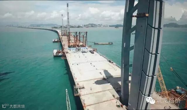 在港珠澳大桥施工现场,看不到人头攒动、千军万马的施工景象,而是为数不多的大型装备在现场进行砌积木式的装配化安装。桥墩、桥面、钢箱梁、钢管桩等都是在中山、东莞等地厂房里建设好,再用巨轮拖到海上,像砌积木一样安装。