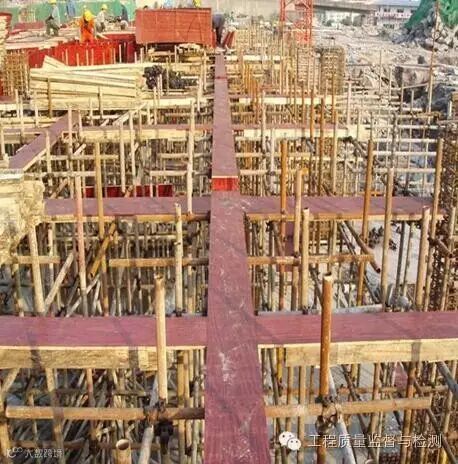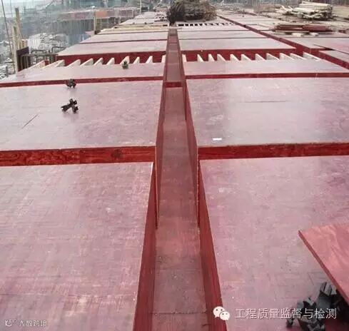 楼板模板:模板支撑体系经过严格验算,并履行审批手续,确保支撑体系的刚度、强度及稳定性。严格控制模板起拱高度,跨度大于或等于4m的梁板按2/1000起拱。跨度8.4m楼板按1.5cm起拱。