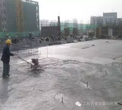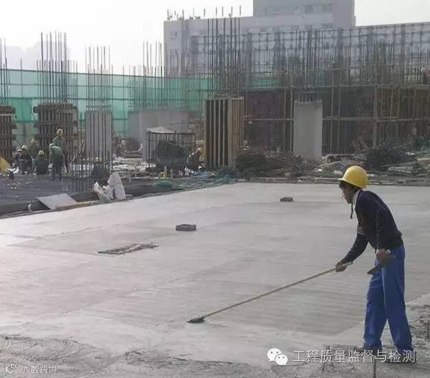 楼板混凝土浇筑:混凝土初凝前用2m刮杠沿四周墙的墙根处向中间刮平,再用压光机压实。终凝前用木摸子搓平,再用铁摸子压实2-3遍,表面塑料条帚扫毛。